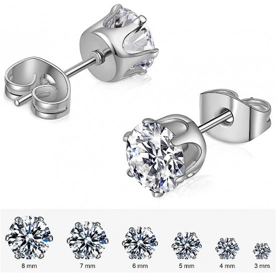 - 【SET OF 6 CZ Stud Earrings】Stainless steel earrings for women,includes 6 pairs of stud earrings for women in 6 sizes(3mm/4mm/5mm/6mm/7mm/8mm), pin size: 10 mm, by butterfly earrings backs and the extra silicone clear earrings backs for you.